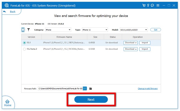 Step 5Lastly, view and search firmware for optimizing your device, then click Next. It will take up time to fix your device, which you can check on the progress bar. After that, your device will work much better now.