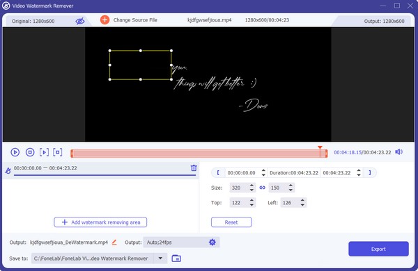 Step 3Click Add watermark removing area, and the box for selecting the watermark will be shown. Drag it to where your unwanted logo, symbol, text, etc., is located for the watermark to disappear. When done, select Export to save it.