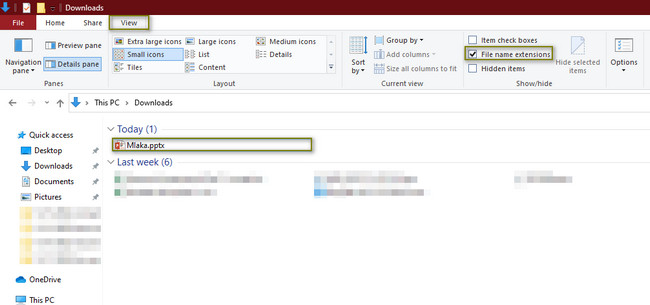 Step 1Locate the File Explorer on your computer. Launch it, then search for the file you want to corrupt. Click the File > View button in the section above, then look for the File Name Extensions. Once you see it, check the box on its left side. Afterward, copy the file and paste it into the same folder.