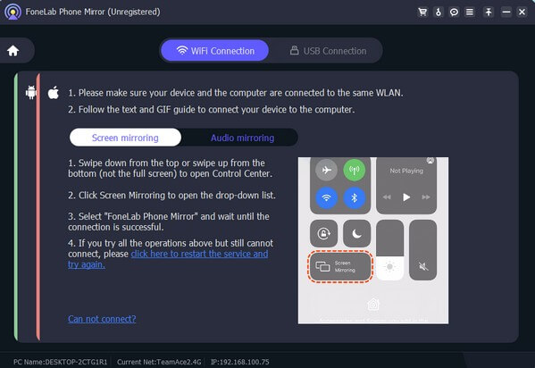 Step 3The screen mirroring on iPhone uses a Wi-Fi network for connection. As mentioned, your device and the computer must link to the same WLAN. After that, navigate to your iPhone and swipe its screen from the top or bottom to access the Control Center. Next, tap the Screen Mirroring icon and choose FoneLab Phone Mirror from the list.