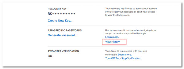 Step 2Go to the App-specific Passwords section on the right of the screen. Then, choose the View History button on the list. Later, the generated app-specific passwords will be shown on the screen. You may copy the ones you prefer to have a duplicate.