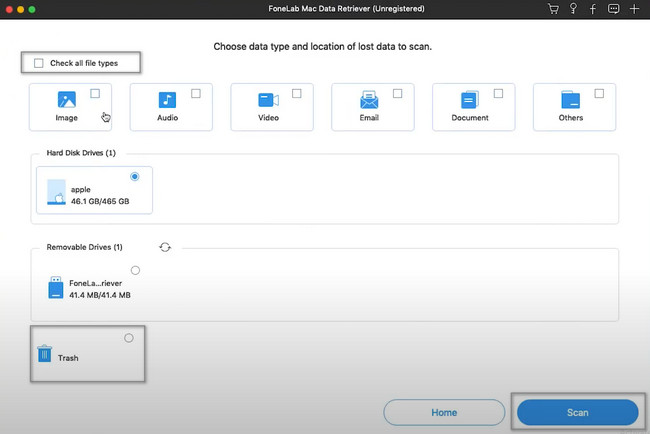 Step 3You do not know the exact files you lost in the process. If you want to see them again, check the box for all the data types this software supports. At the bottom of the main interface, you will see the Trash Bin icon. If you also want to check this location, tick its Circle button. If the data types and locations are enough and ready, click the Scan button.