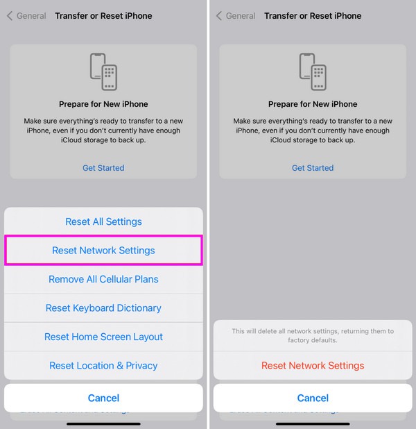 Step 2On the next screen, select the Reset tab, and more options will pop up. Then, select Reset Network Settings and tap the same option to confirm resetting your network settings.