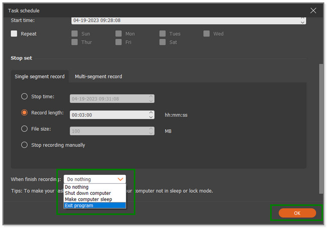 Step 4At the bottom of the software, you will see the When Finish Recording section. Click the Arrow-Down button on its right side. Later, you can choose among the options. It includes Do Nothing, Shutdown Computer, Make Computer Sleep, and Exit Program options. Afterward, click the Start button to apply the changes.